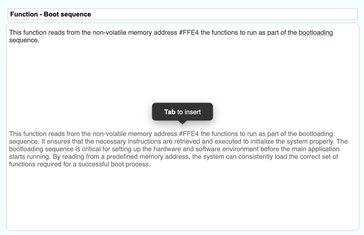 The options function similarly: they display updated text below the active editor. Press the Tab key to insert the suggestion or any other key to cancel and continue editing the original text: