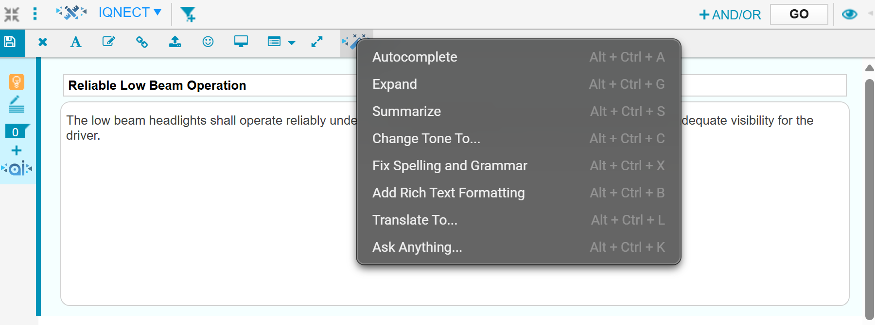 To help you write requirements faster, IQNECT offers an Autocomplete feature available in most requirement editors. Look for the magic wand icon in the editor toolbar to access it. Clicking this icon opens a menu with multiple options: