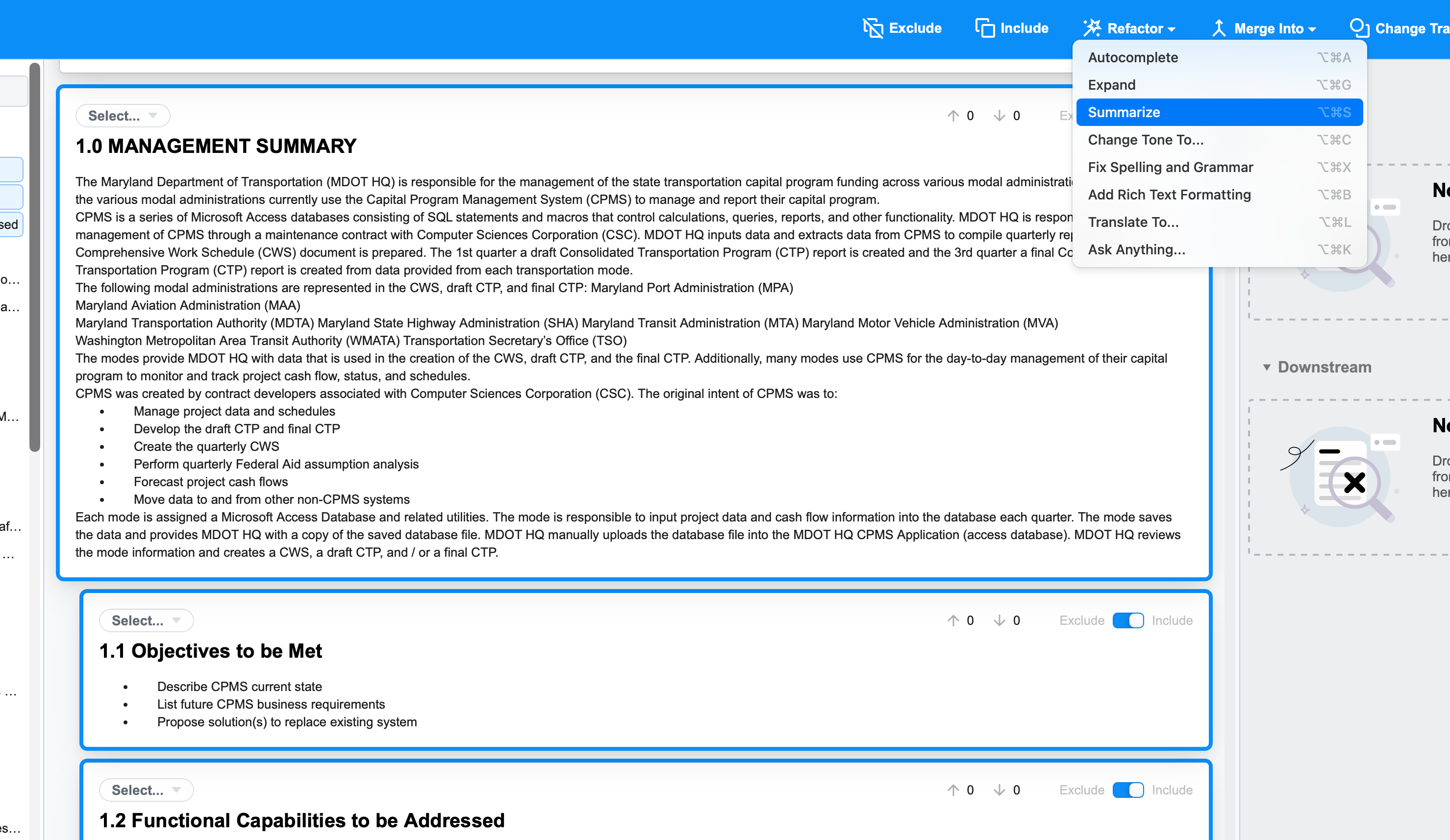 When importing a document, select one or more imported items and open the Refactor dropdown to refine/edit content before finalizing tracker updates.