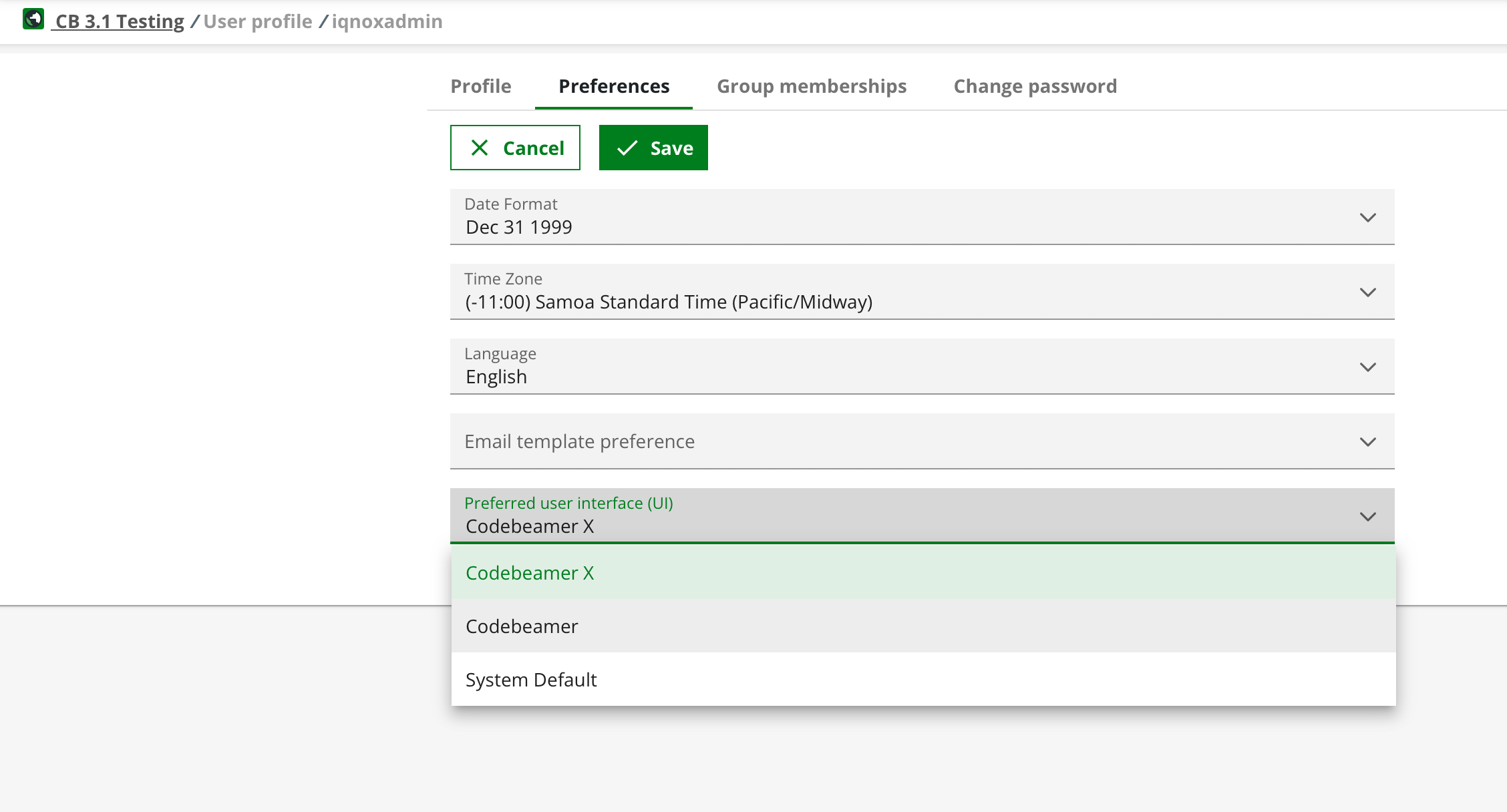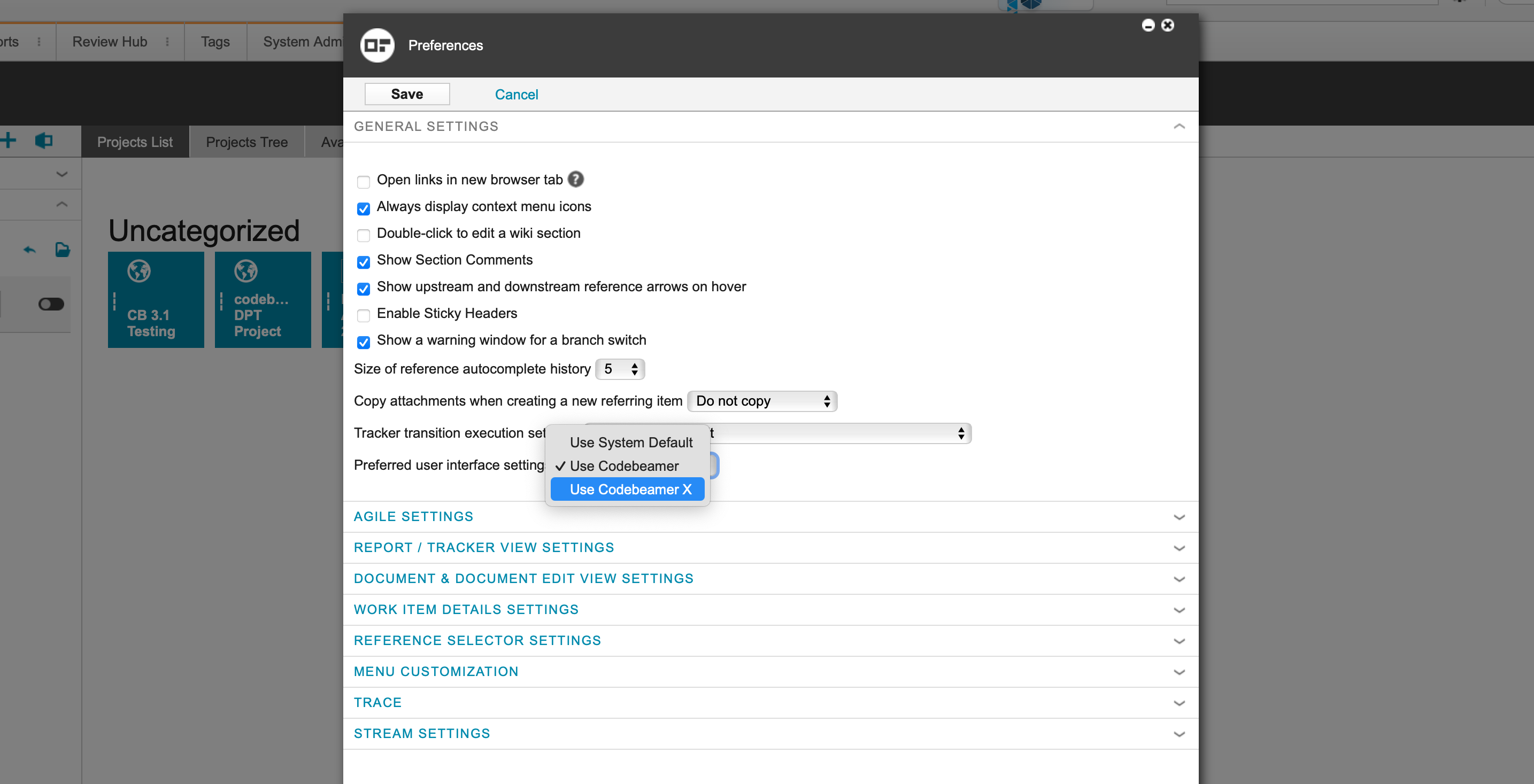 In the Preferred user interface settings dropdown, locate the Use Codebeamer option.