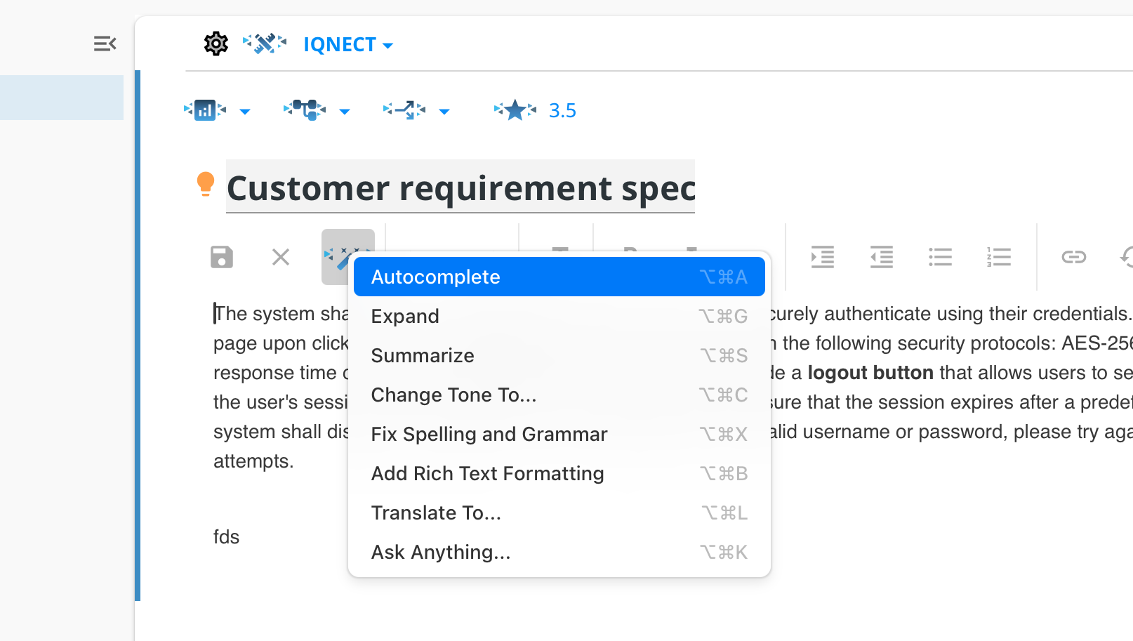 IQNECT features are now found in a menu at the top of the item view rather than the left-hand AI icon used in the previous UI.