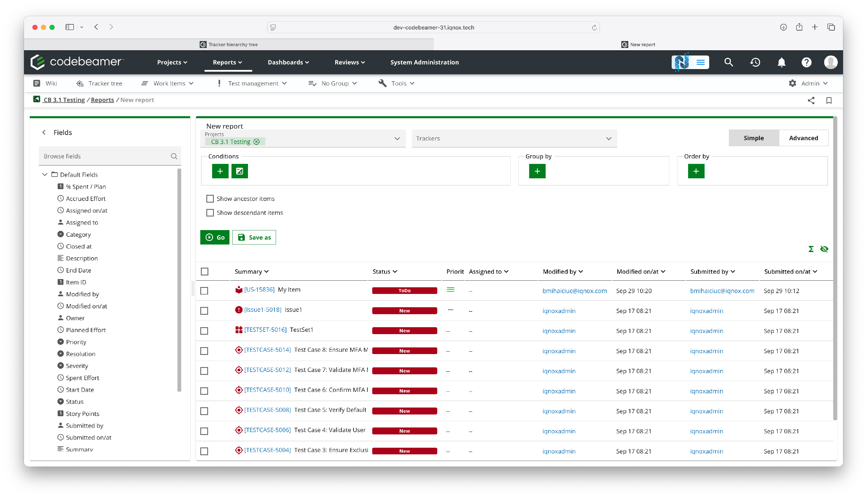 Note: The Index function, located in the previous UI under Reports → New Report → GO, has been removed from Codebeamer X.