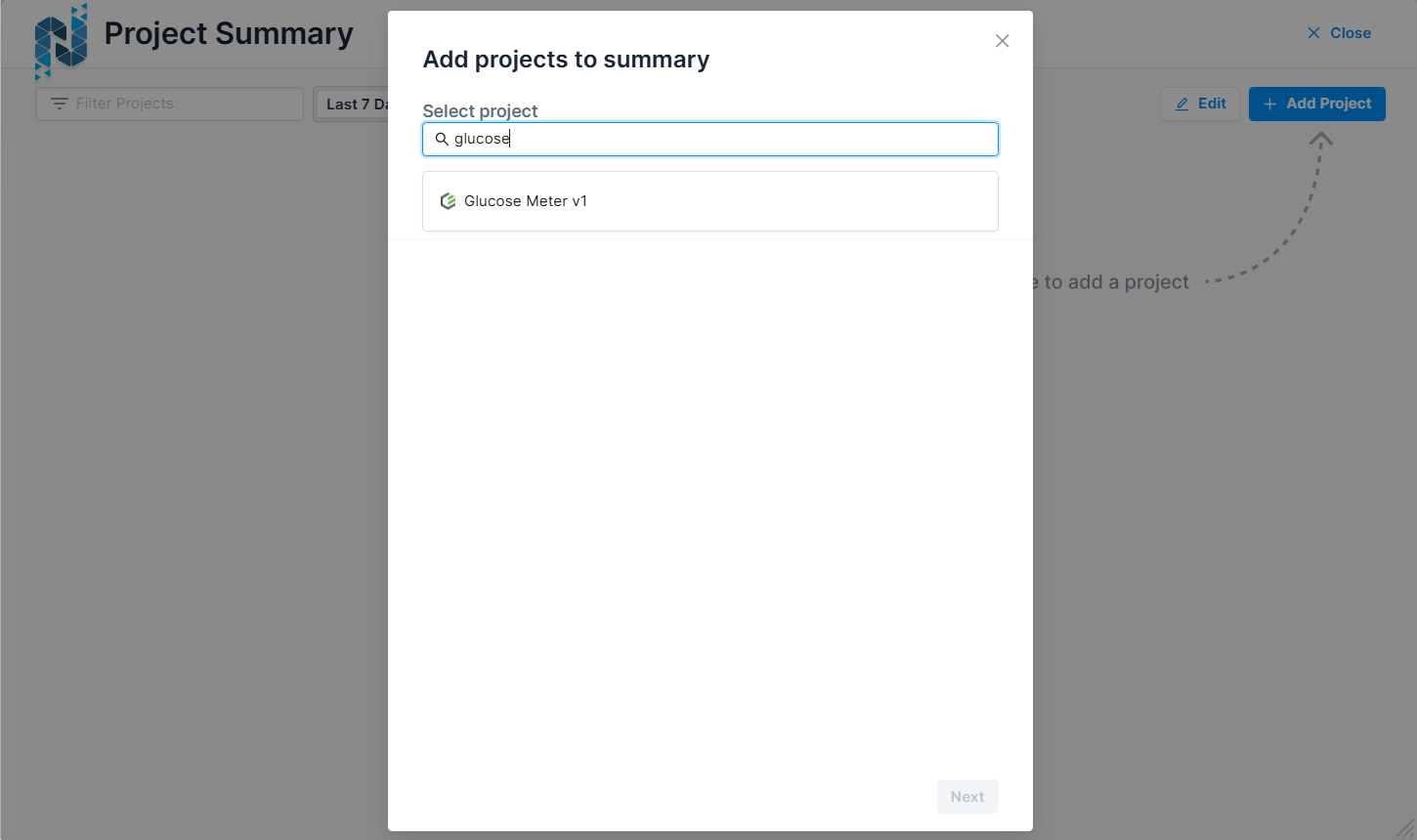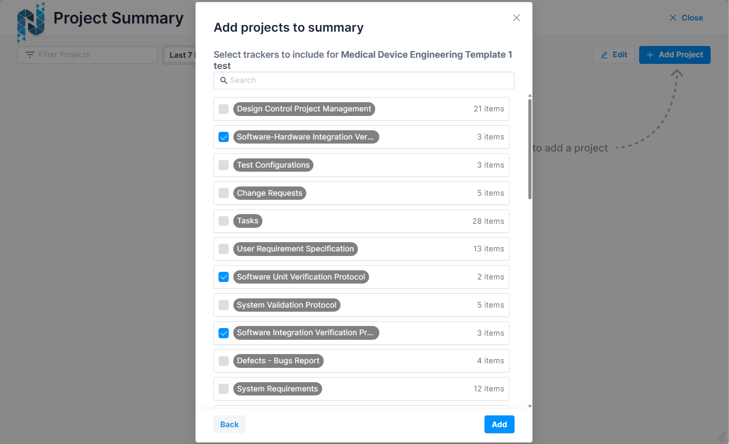 - In the popup, select any project available to you in Codebeamer that is not already on your dashboard.