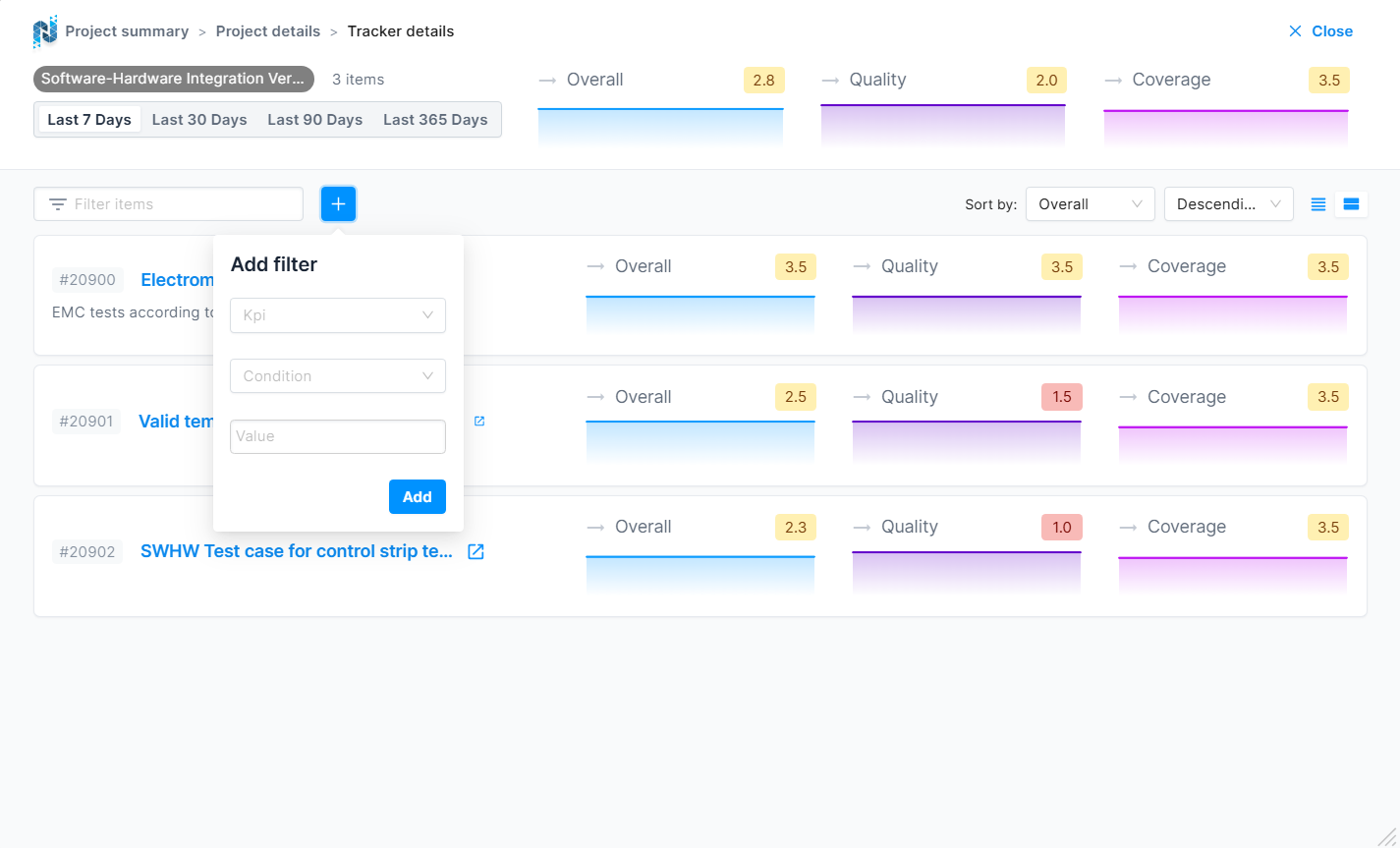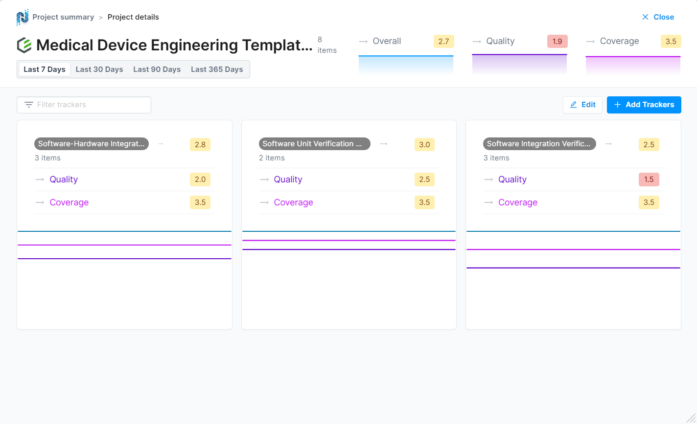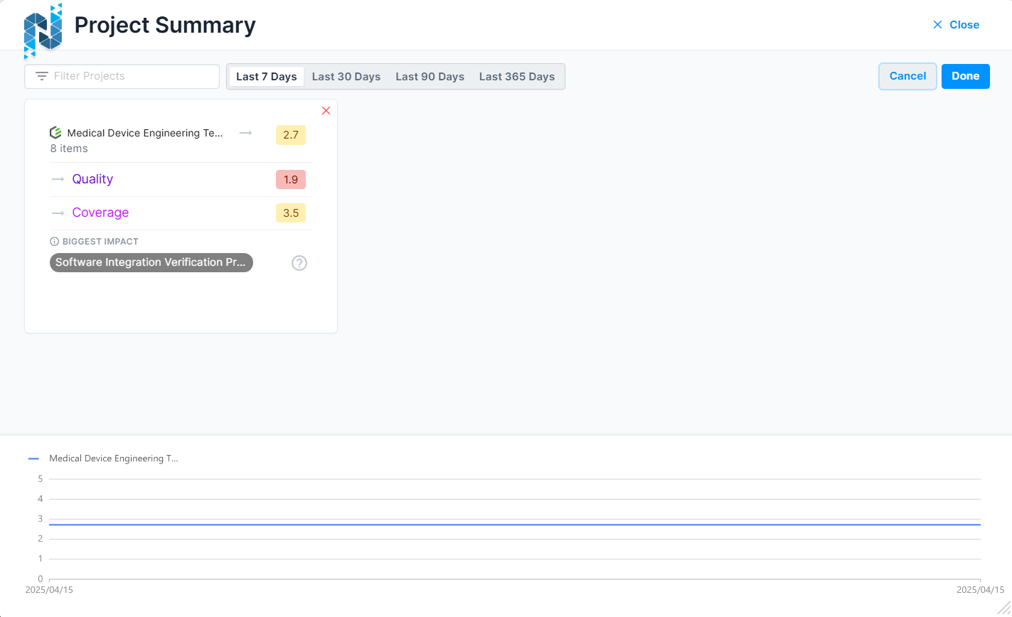 Use these views to evaluate project health, monitor trends, and understand quality metrics across a connected ALM environment such as Codebeamer.