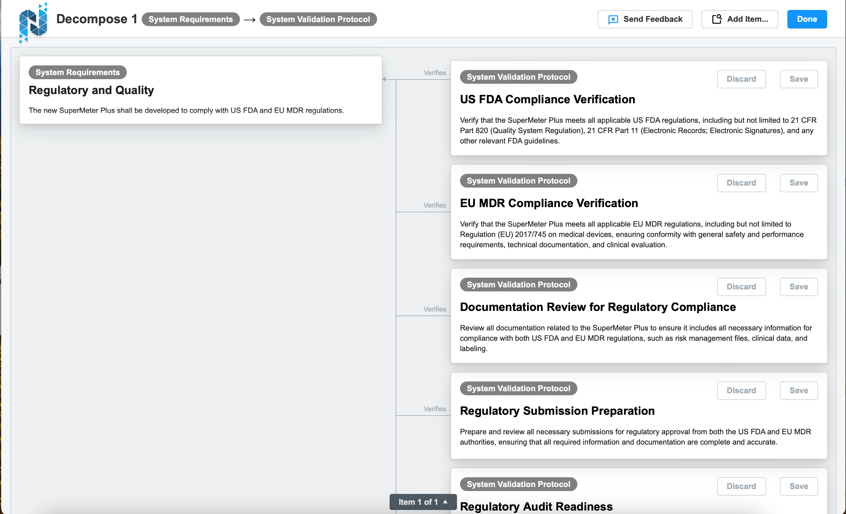 After reviewing, editing, adding, or discarding generated items, you can finalize the downstream structure and continue working within your tracker. Decomposition ensures each upstream requirement or document section is fully represented in actionable, well-structured downstream items.