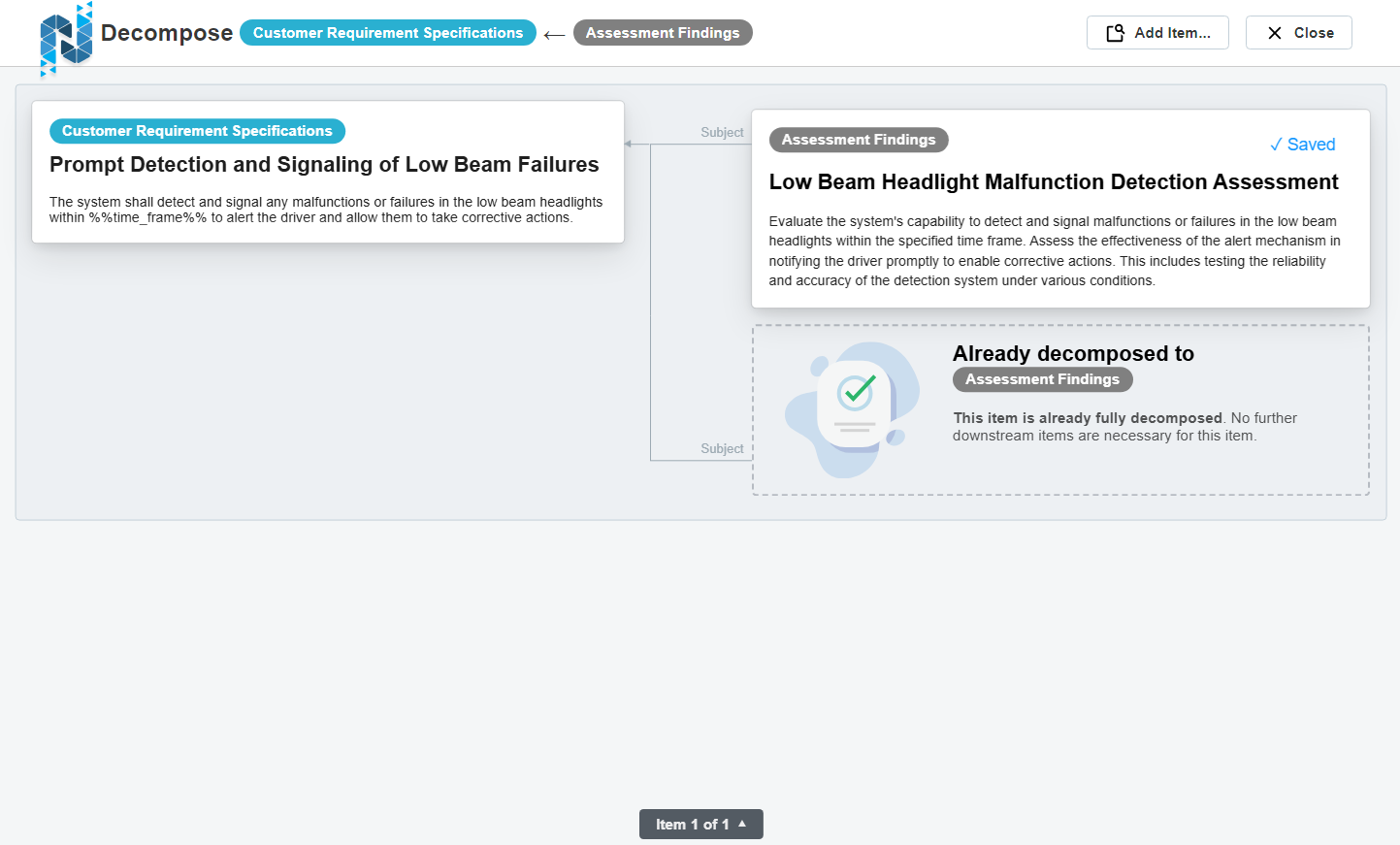 This article describes how to use the Decompose feature to create downstream items from one or more source items in IQNECT. Use this workflow when you need to break a requirement, specification, or document section into structured, actionable items within your tracker.