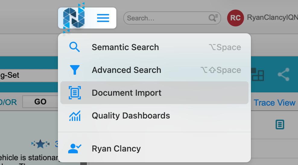 Click the hamburger menu beside the IQNECT logo in the top-right corner of your screen, and select Document Import.