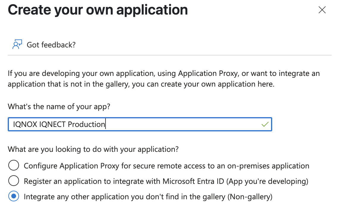 Since IQNECT is not a gallery application, you must choose "Integrate any other application you don't find in the gallery (Non-gallery)."