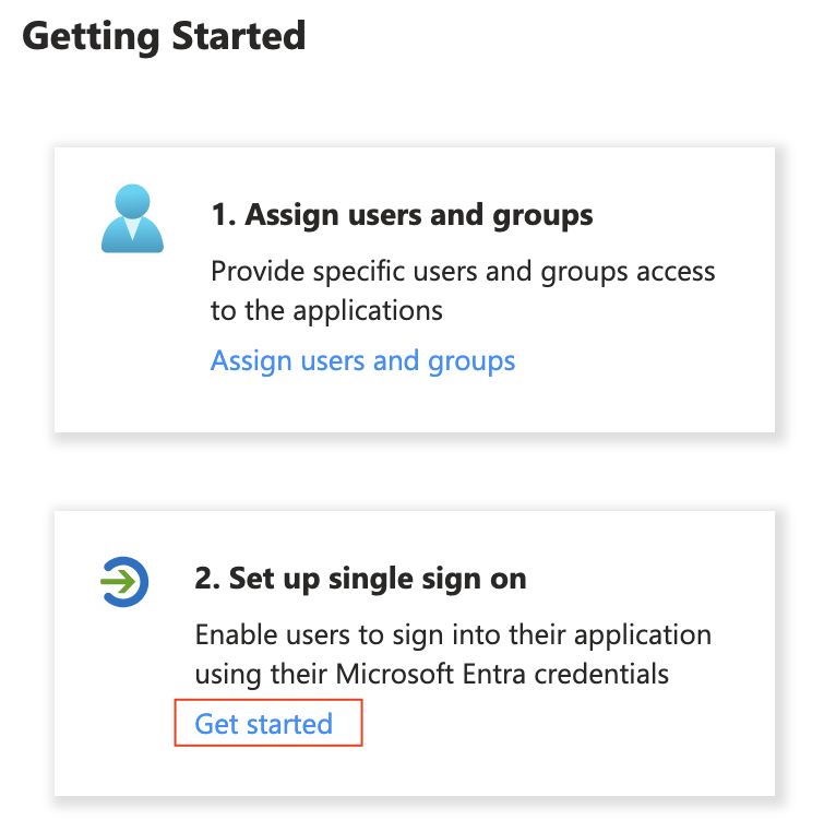 In the "Overview" page of the new application, click 'Get Started' in the '2. Set up single sign-on' card: