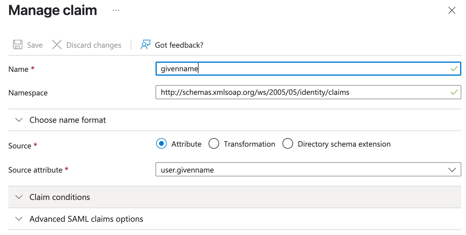The "Claim Name" consists of the namespace concatenated with the name of the attribute. For example, the "claim name" for this attribute is http://schemas.xmlsoap.org/ws/2005/05/identity/claims/givenname .