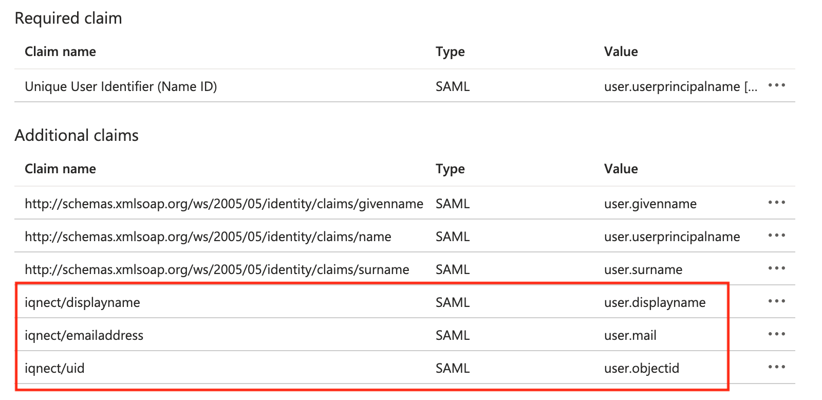 - SAML claim name for the user's display name, email address, and unique identifier.