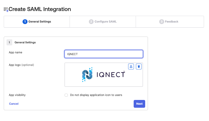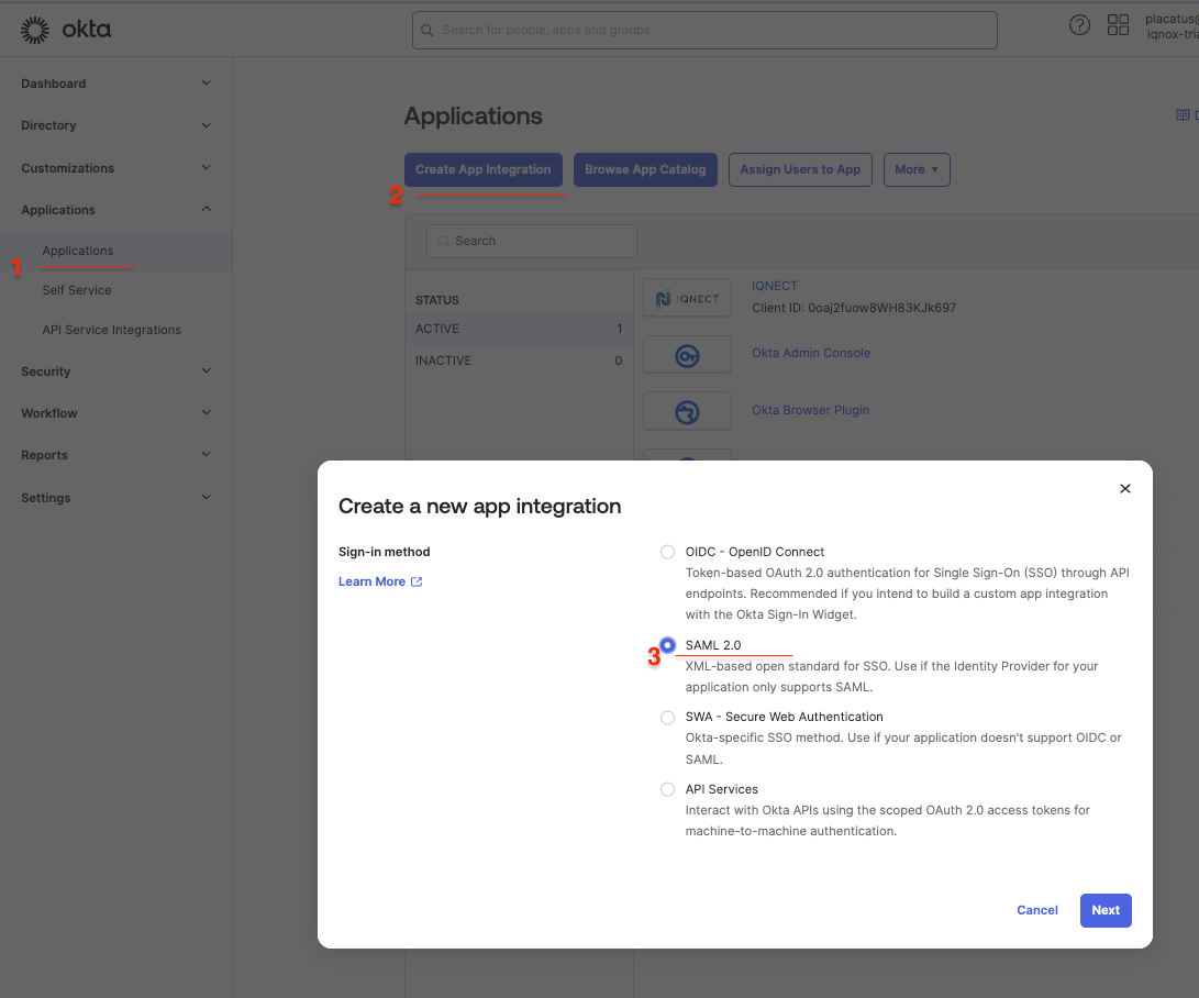 If your organization uses Okta Identity Provider (IdP) for user authentication, you can configure IQNECT to allow your users to log in using their IdP credentials. Note that both SAML 2.0 and OIDC protocols are supported when using OKTA as an IdP. This page is specific to SAML 2.0. For OIDC, go to Okta OIDC.